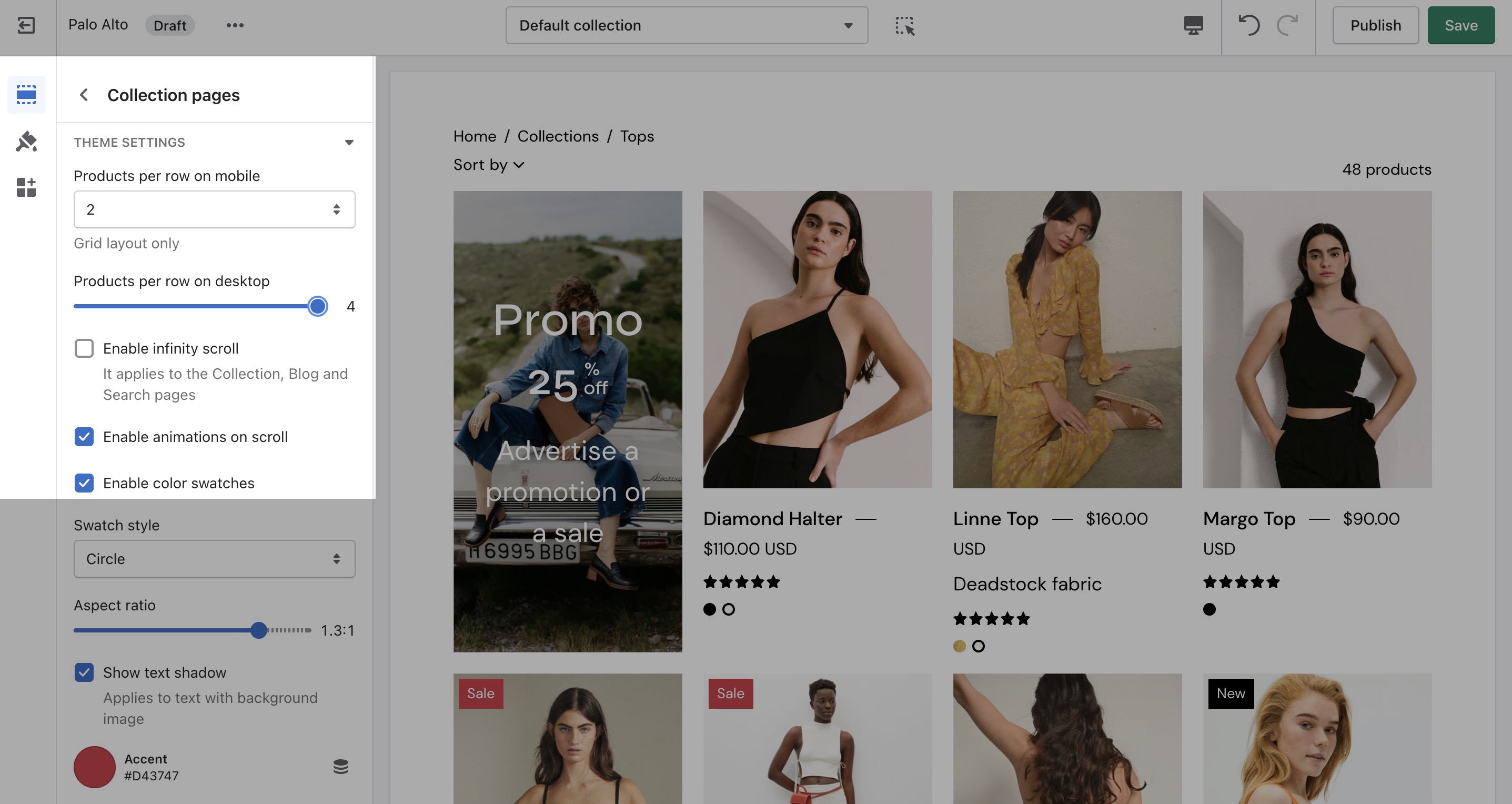 Use the Product Grid options to customize how many products per row are displayed on desktop and mobile.