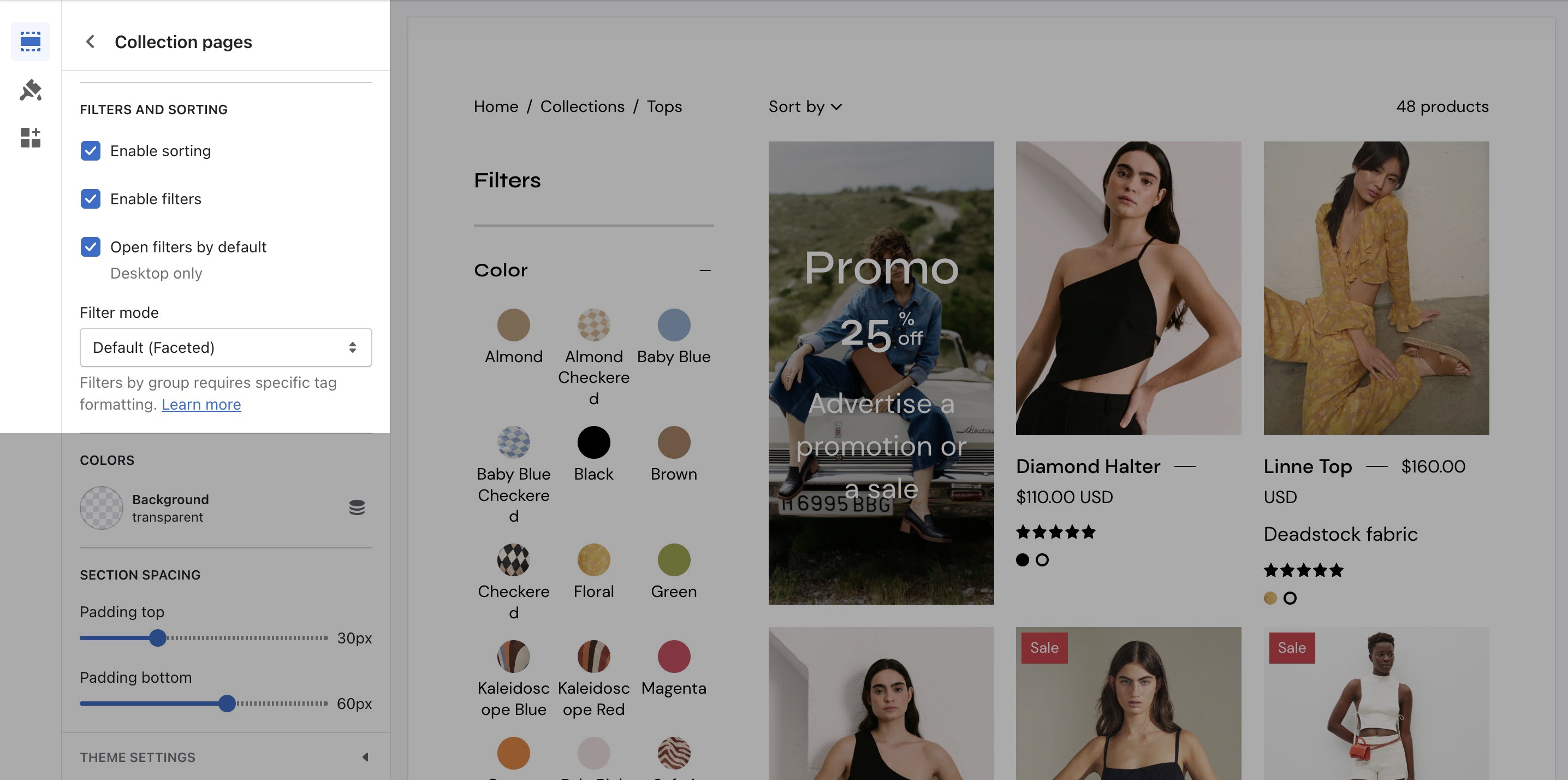 Palo Alto has three filtering methods to choose from. They can be found under the Collection products section settings.