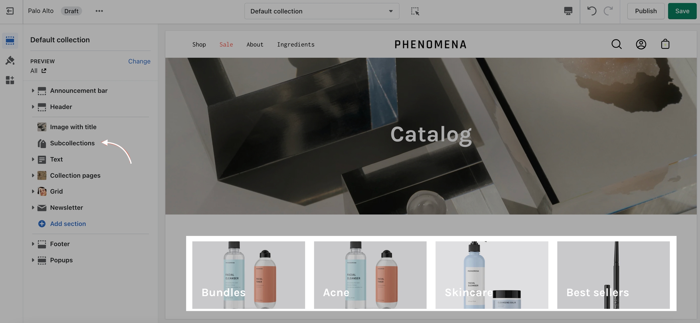 Palo Alto uses Shopify's Navigation menu system to bring custom menu items into any collection page and displays them as sub-collections with a graphical image, collection name, description, and link.