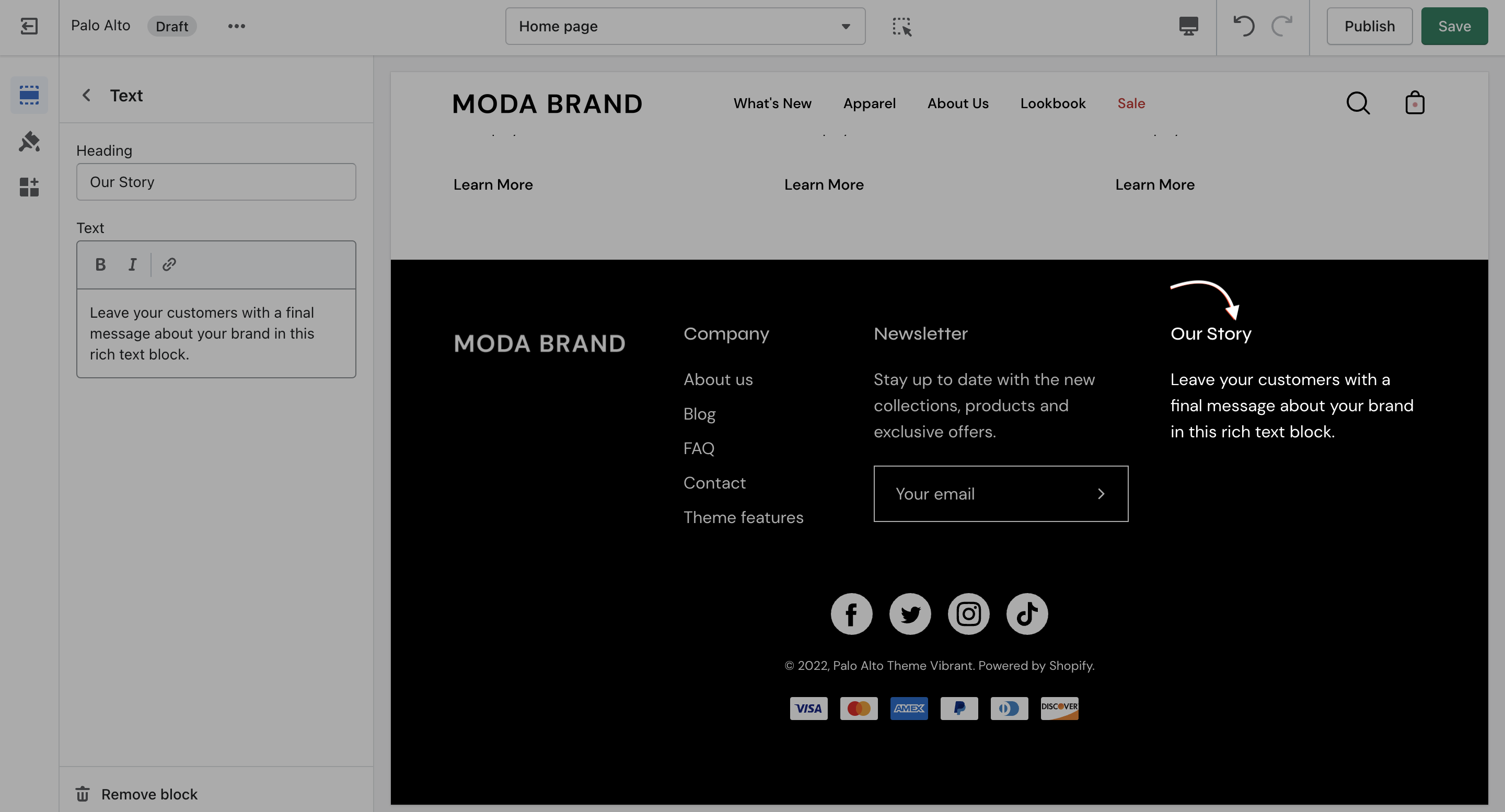 A text block does as a text block sounds. You can add a short message with a heading to give information about your brand or current promotions.
