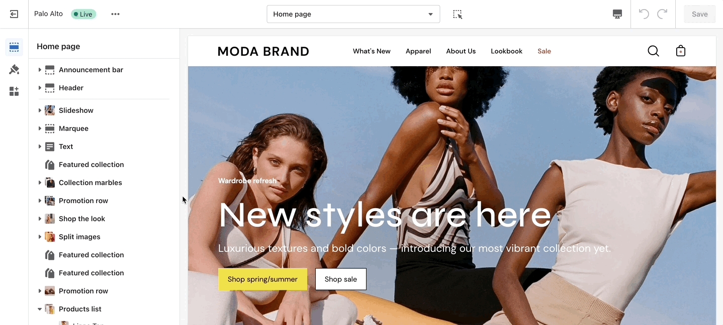You can start customizing the page with the pre-defined sections included in Palo Alto. You can hide, reorder, remove sections that are included and also add any new selection from Palo Alto's list of over 25+ sections.