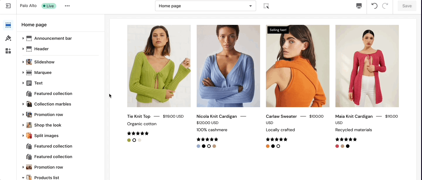 With Palo Alto, you can upload your own custom swatch images and display them on product and collection pages.