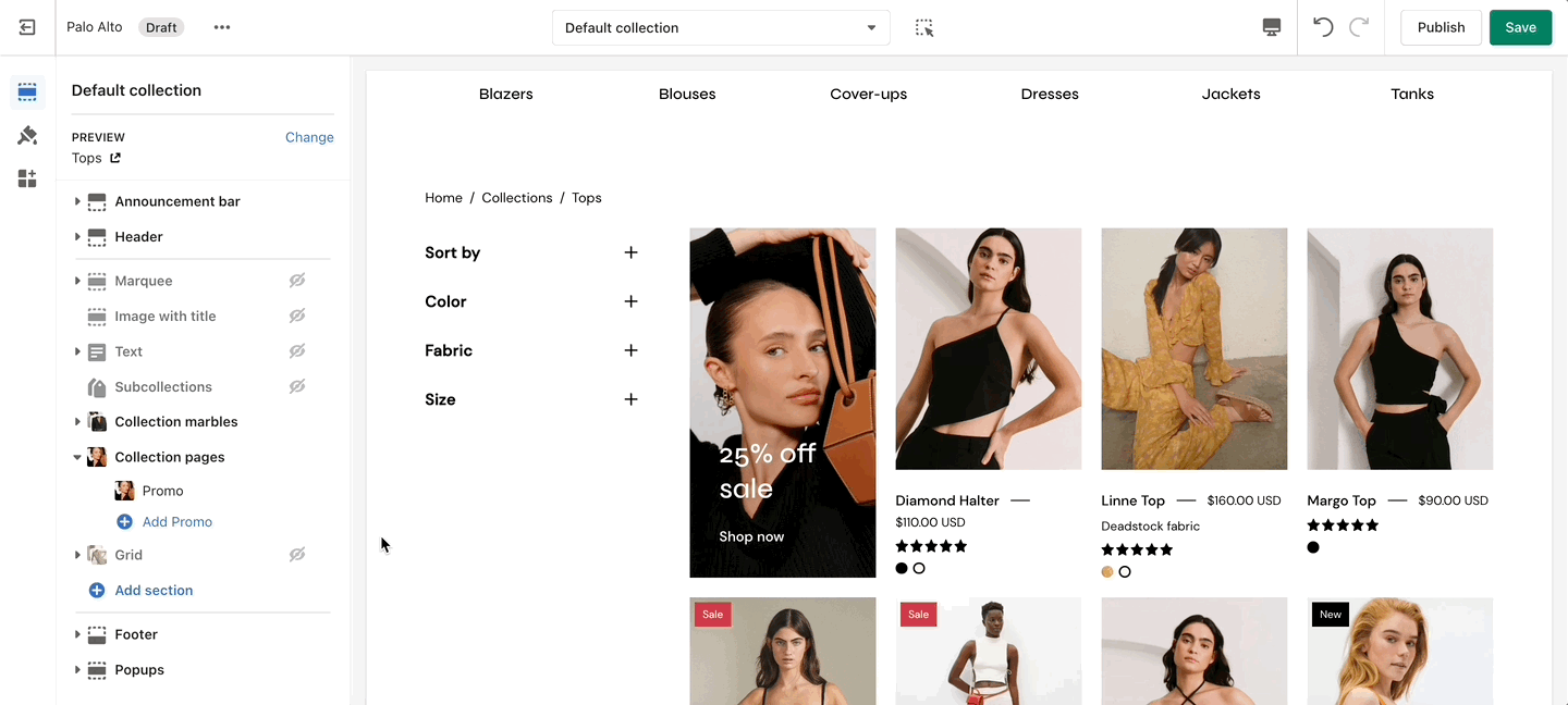 Palo Alto includes quick and easy settings in the Theme Editor to display ratings. The main requirement is that you have the Shopify Reviews app installed: