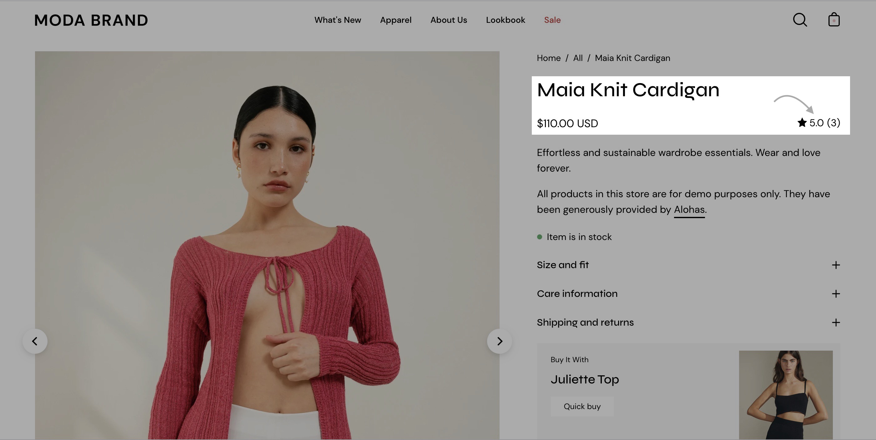 For the Product Detail page, you can easily add the rating value, star, and the number of ratings from the **Title and price** block under the Product pages section: