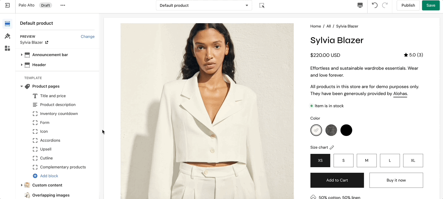 Displays all buying-related elements including product variants and swatches, quantity selector, the add to cart button, and the buy it now button.