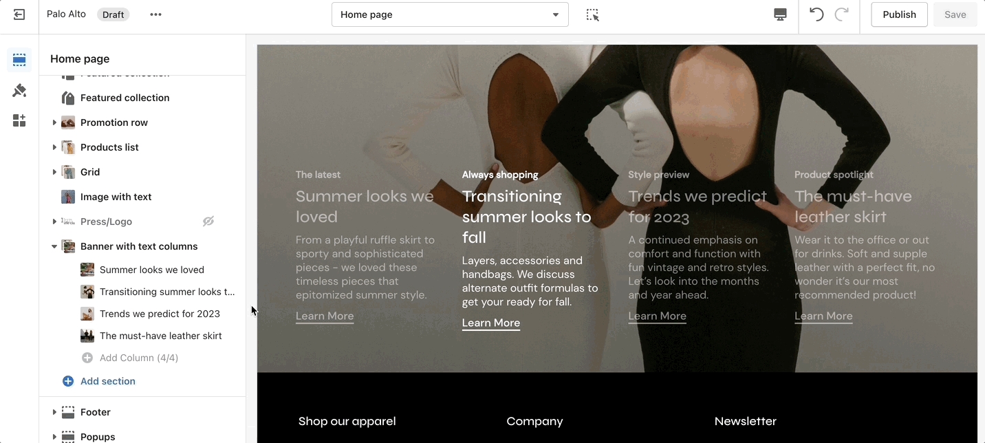 Set the section height and text color from the main section settings. Adjust each individual Column from a new block.