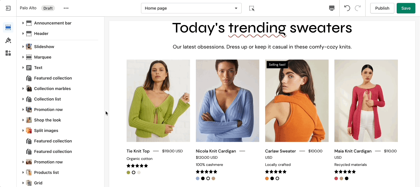 The 'Featured collection' section allows you to highlight a specific collection of products on your store pages. This section generates blocks with links to each product page.
