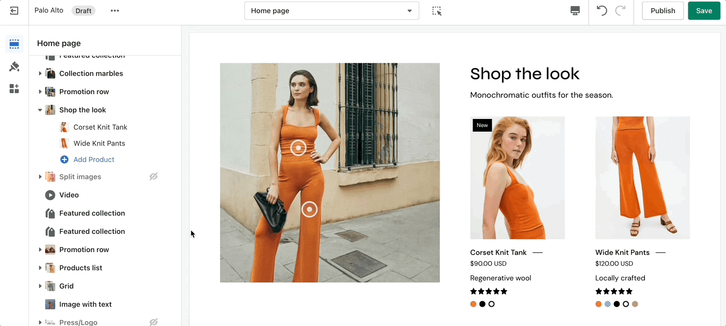 'Shop the look' allows you to use images and dots to highlight specific points of your products. Use this section to create a unique way of getting your customer's attention!