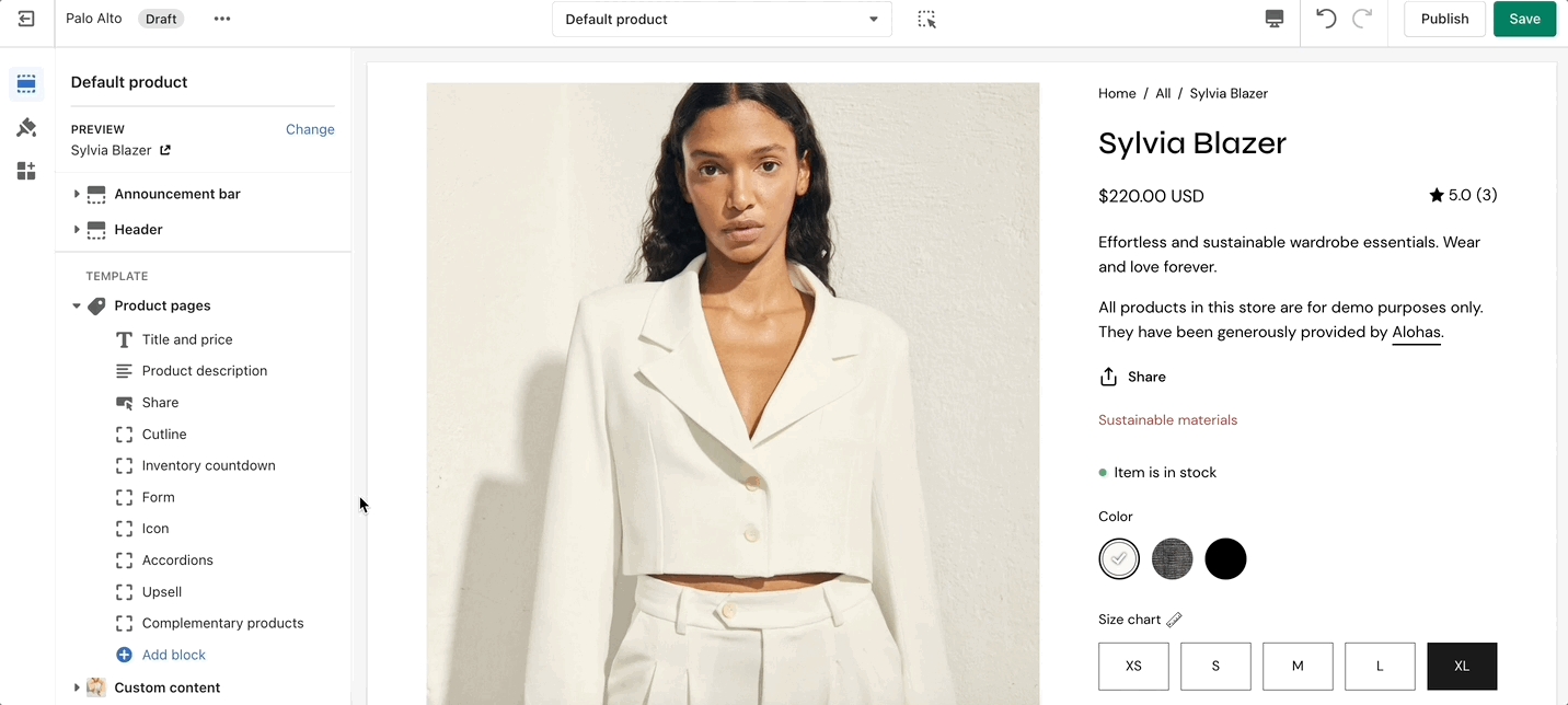 The new Product page sections in our Palo Alto theme are built from the ground up with the new features introduced in Online Store 2.0 in mind. The use of JSON templates allows for dynamic sections to be used to truly customize your product pages to your style.