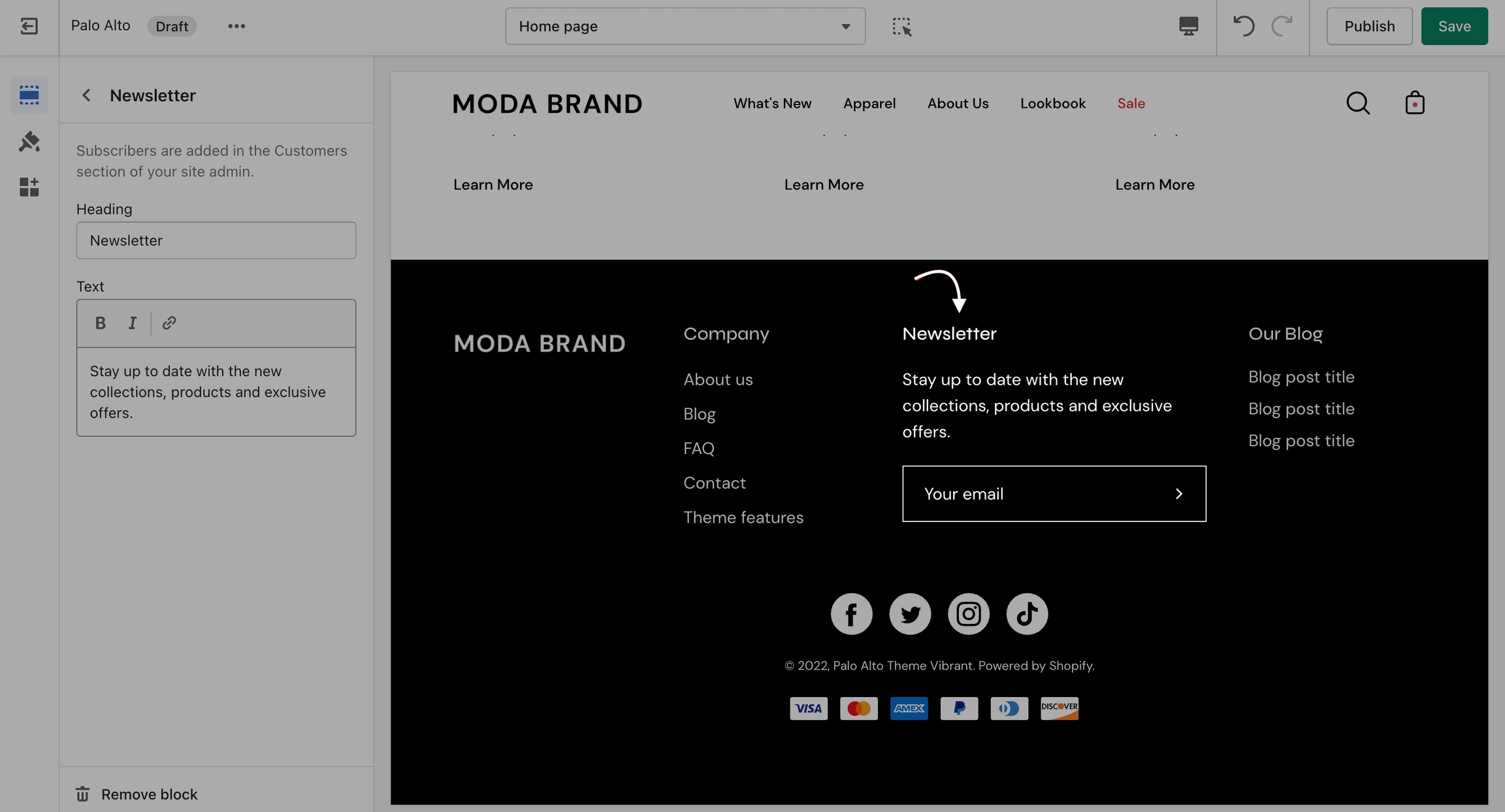 A big part of the settings can be accessed from the section blocks. They can also be moved around if you're looking to customize the look. You can move blocks the same way you move sections.