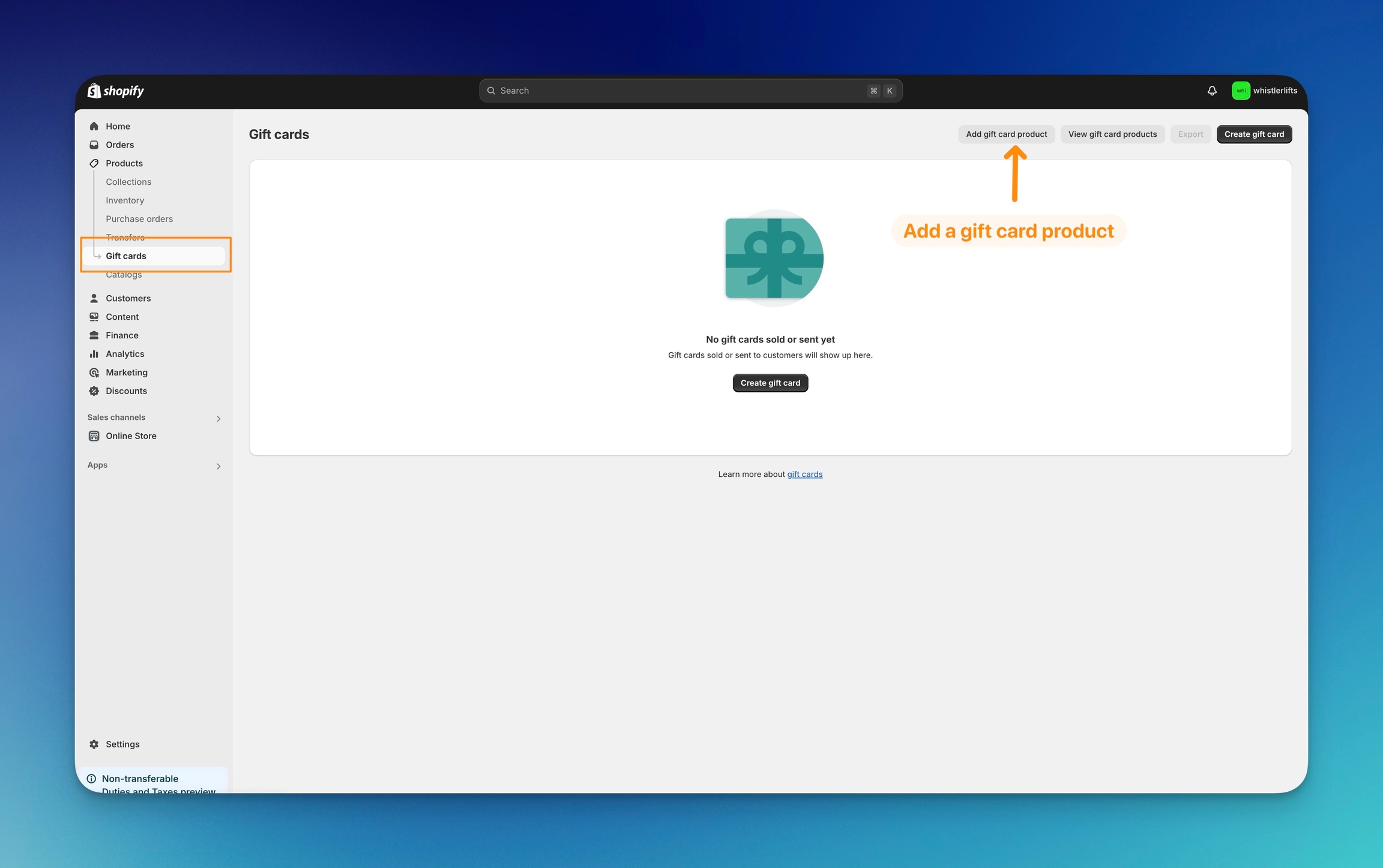 Start by creating a gift card product in your Shopify Admin under Gift cards: