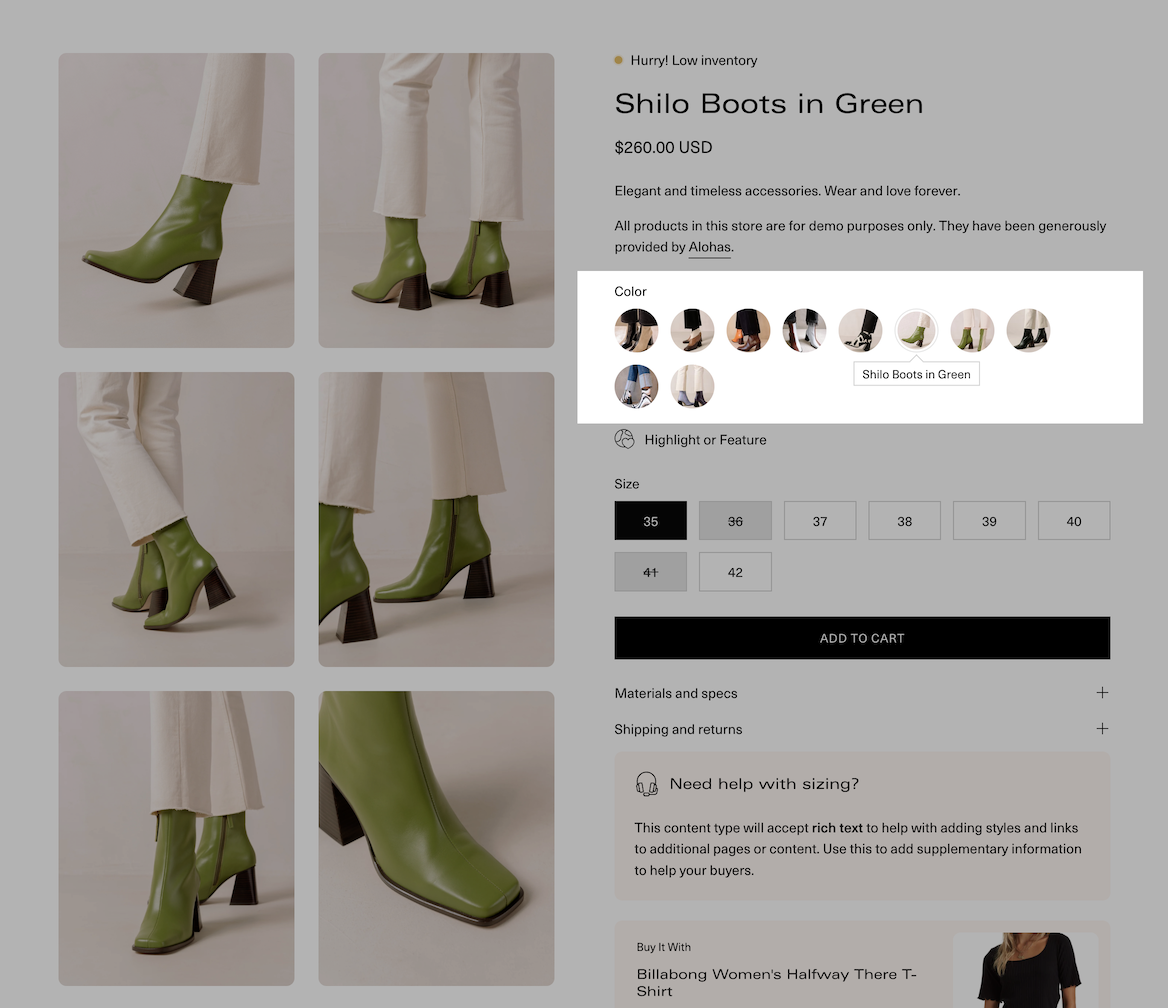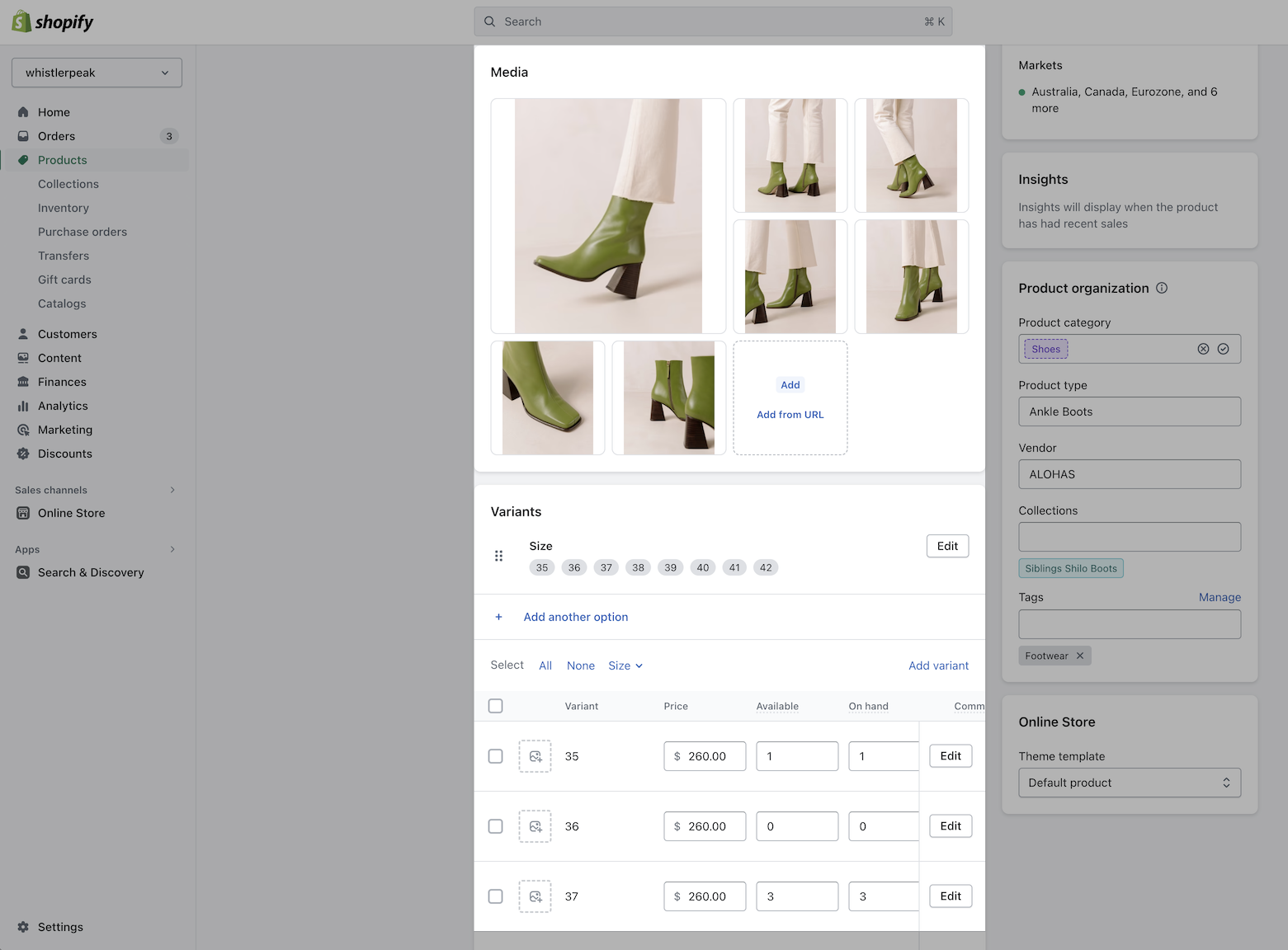 Each product can have its own images, inventory, prices, description, and variants like size: