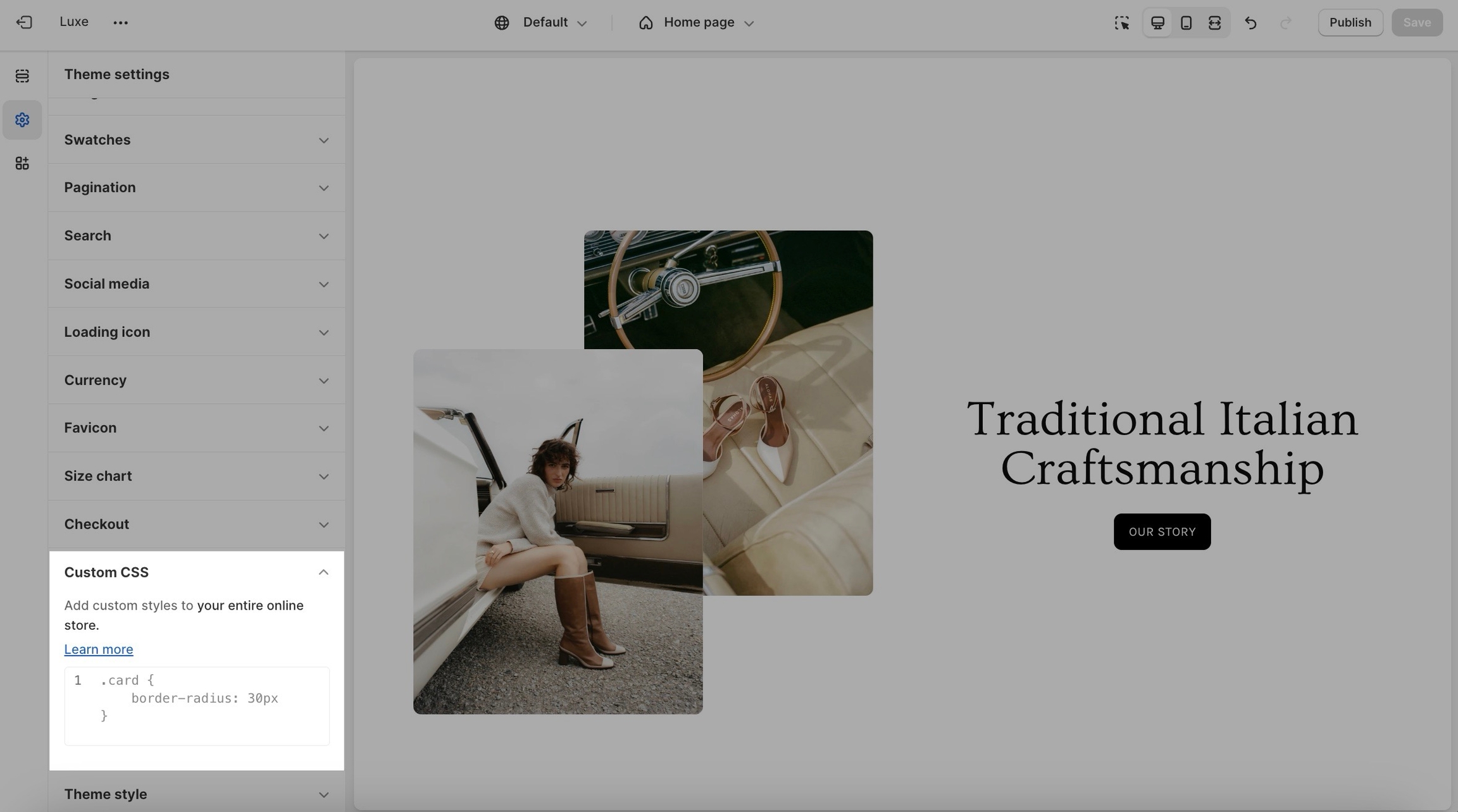 Custom CSS is a new block added by Shopify for all themes. Use it to add your own CSS without the need to access the theme code.