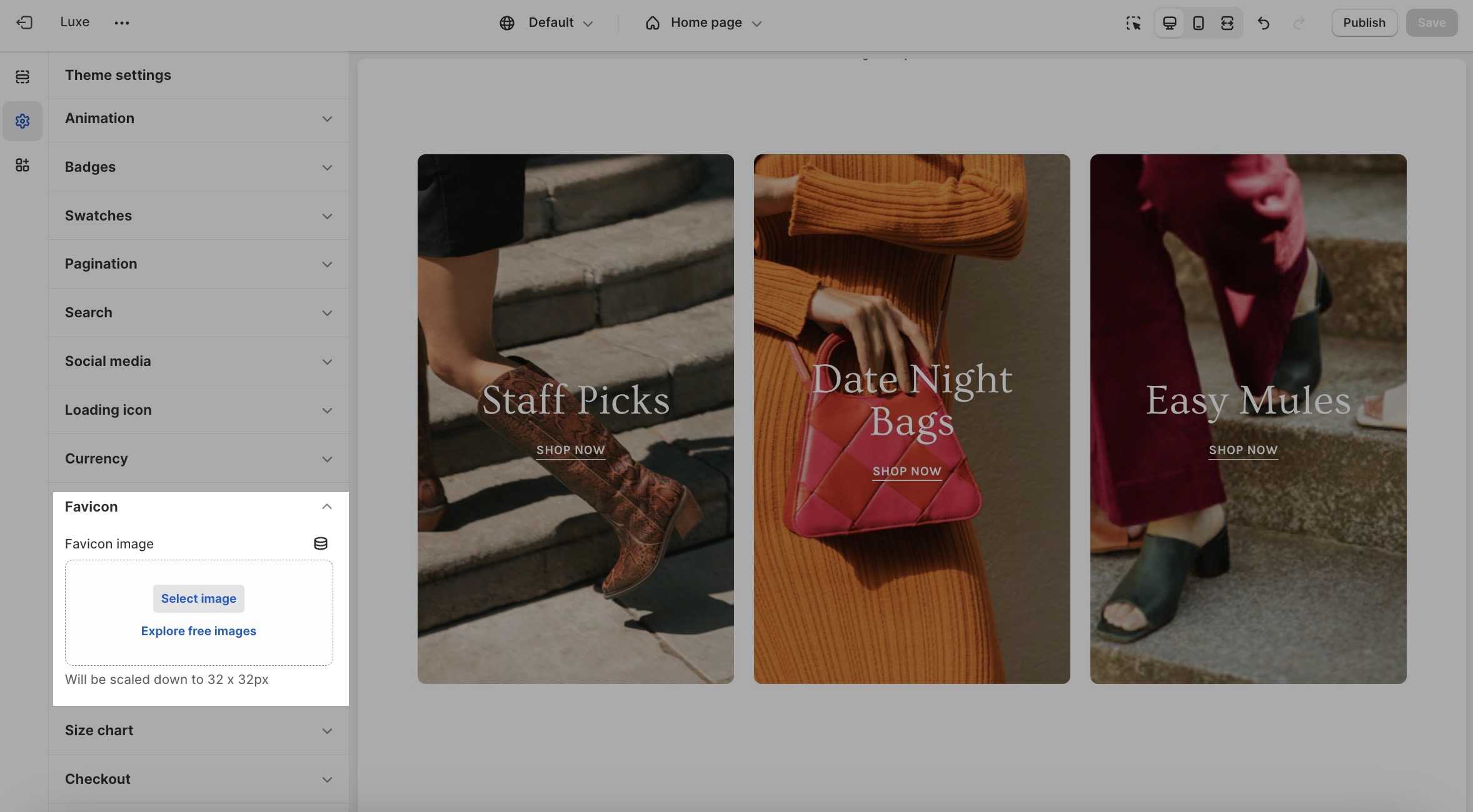<table><thead><tr><th width="133.5963134765625">Settings</th><th width="140.650146484375" align="center">Type</th><th>Description</th></tr></thead><tbody><tr><td>Favicon image</td><td align="center"><code>image_picker</code></td><td>Upload an image. Recommended size: <code>32 × 32px</code>. Larger images will be automatically scaled down. </td></tr></tbody></table>