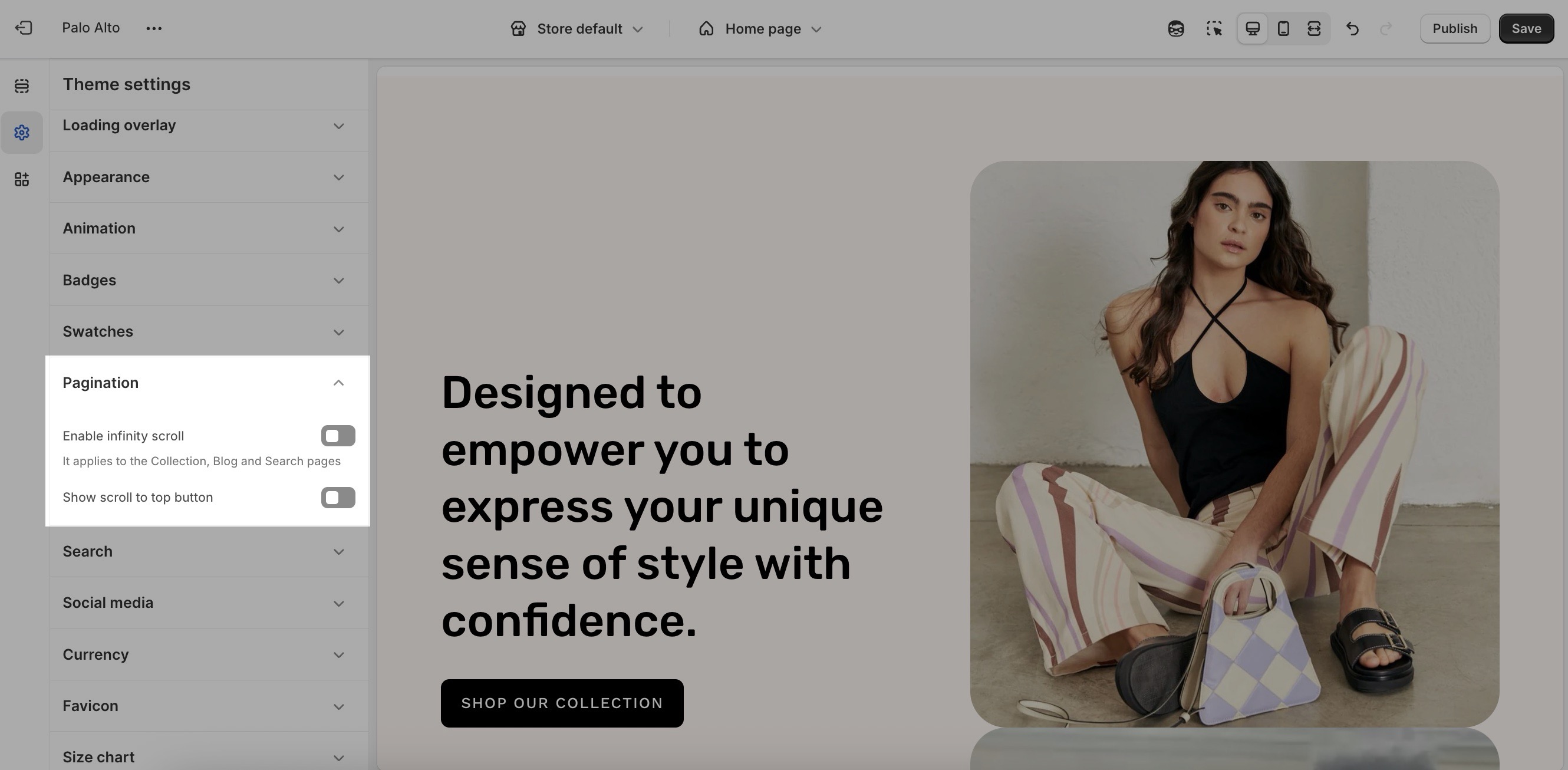 <table><thead><tr><th width="209.36456298828125">Settings</th><th width="108.19708251953125" align="center">Type</th><th>Description</th></tr></thead><tbody><tr><td>Enable infinity scroll</td><td align="center"><code>checkbox</code></td><td>When enabled, new content automatically loads as the user scrolls down the page. Applies to <code>Collection</code>, <code>Blog</code>, and <code>Search</code> pages.</td></tr><tr><td>Show scroll to top button</td><td align="center"><code>checkbox</code></td><td>Floating button that scrolls to the top for easier navigation on long pages.</td></tr></tbody></table>