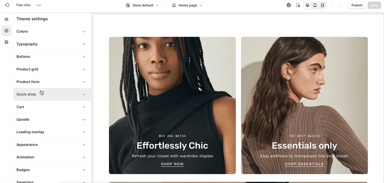 <figure><img src="https://891064830-files.gitbook.io/~/files/v0/b/gitbook-x-prod.appspot.com/o/spaces%2Fz8oqtXqtdhOM4CxRzekr%2Fuploads%2FQcr2DcWuodZ0lXpLiQkc%2Fquick-shop-theme-settings.gif?alt=media&#x26;token=1be4234c-095c-4a7b-b36d-0941fac79466" alt=""><figcaption></figcaption></figure>