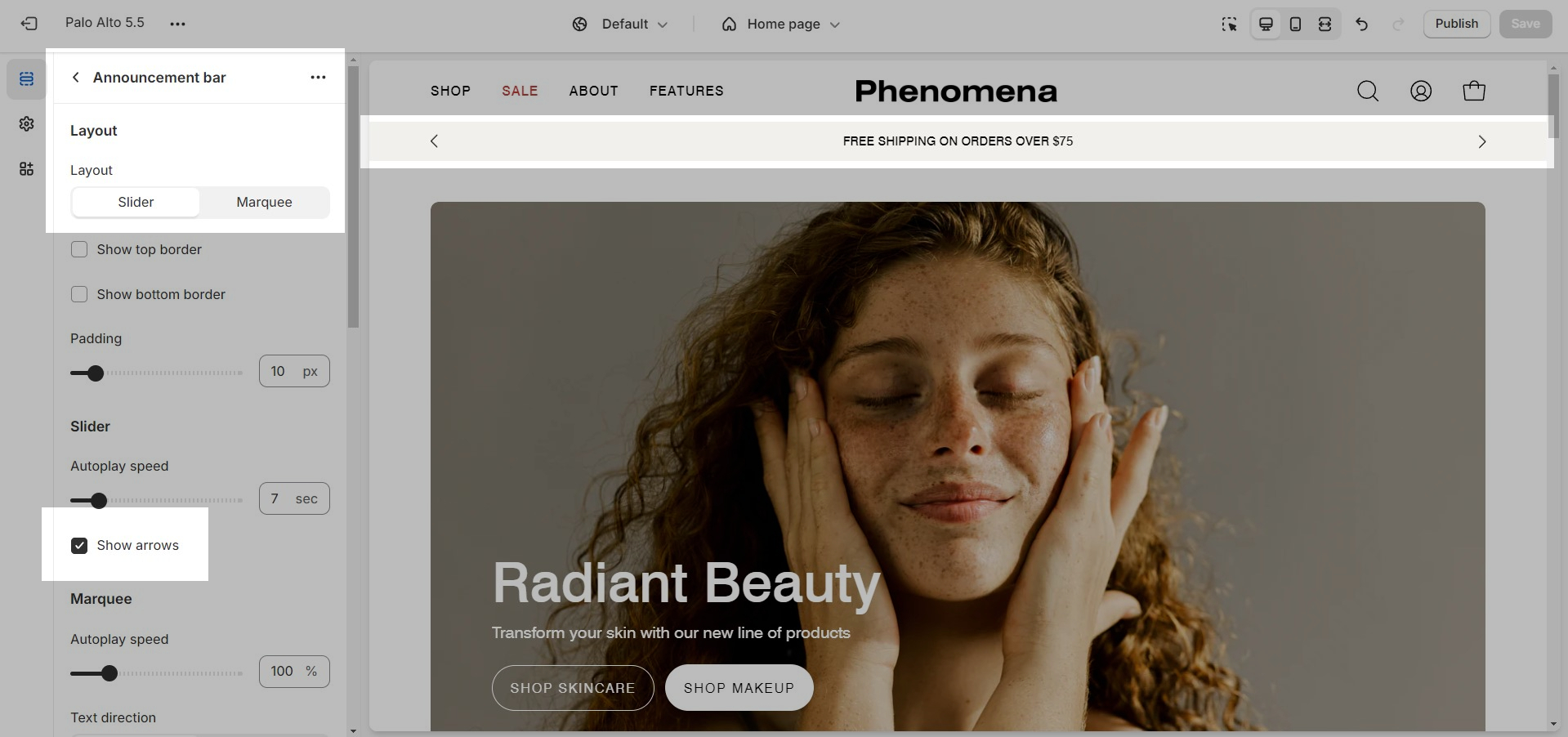 The announcement bar and marquee sections now have the option to toggle navigation arrows for the slider layout.