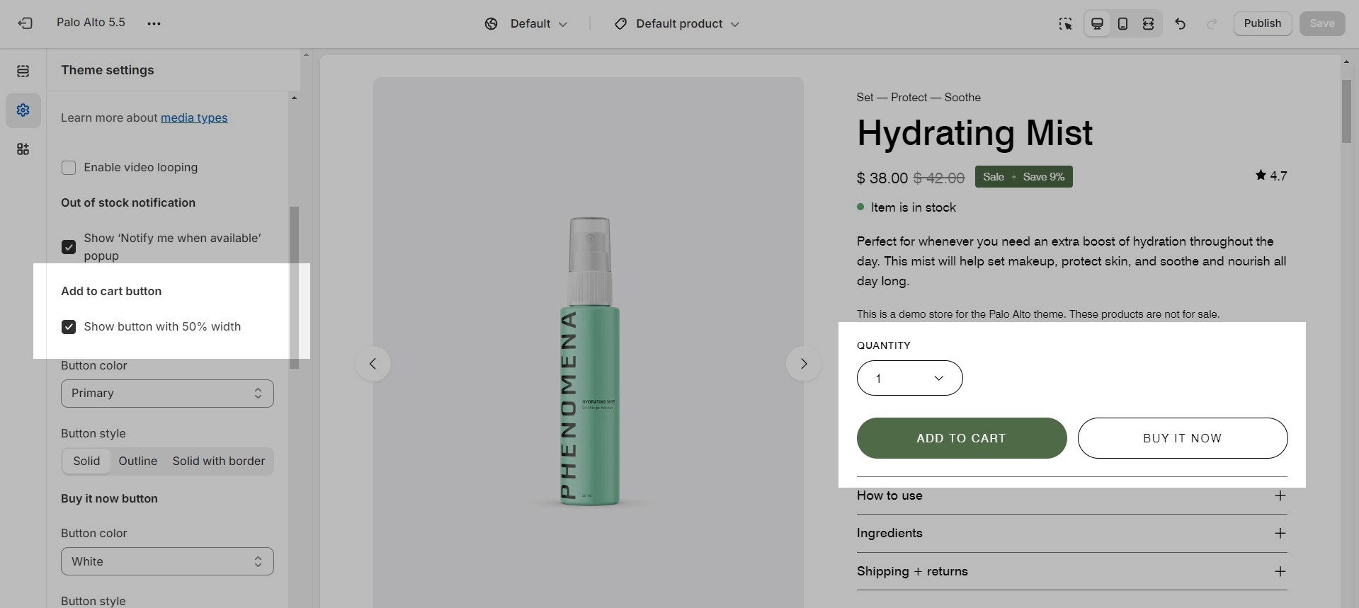 The 'add to cart' and dynamic checkout buttons, on product pages, have the option to be displayed with either half or full-width: