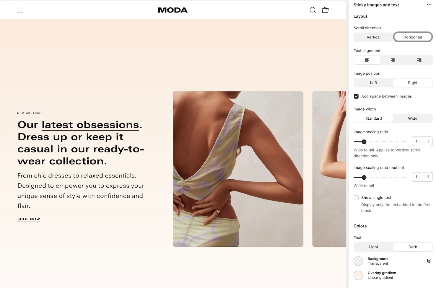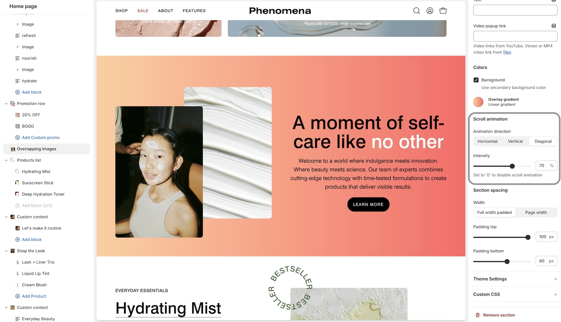 Customize the animation direction and intensity to enhance your store's scrolling effect.