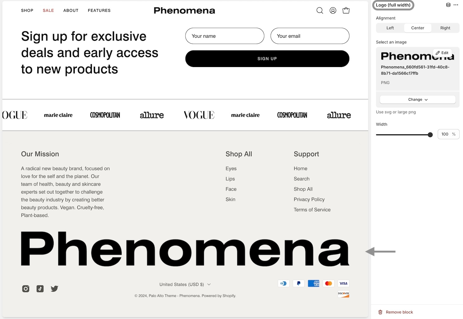 New in Palo Alto is the "Logo full width" block for building beautiful, rich footers. Showcase your brand for a modern footer design: