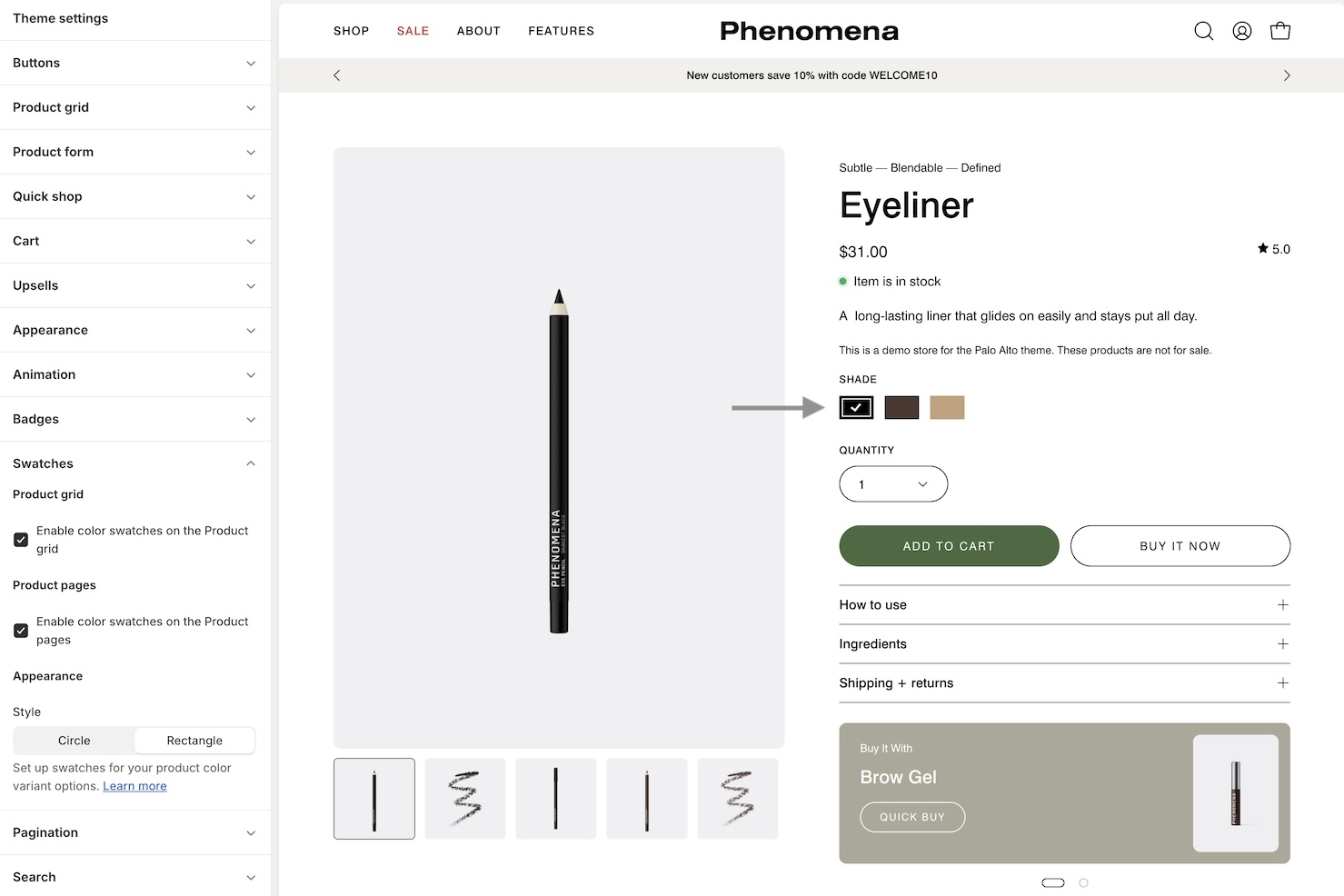 We've added a checkmark to the selected variant option to the rectangular swatch design. This visual effect helps customers ensure they have chosen the correct variant option:
