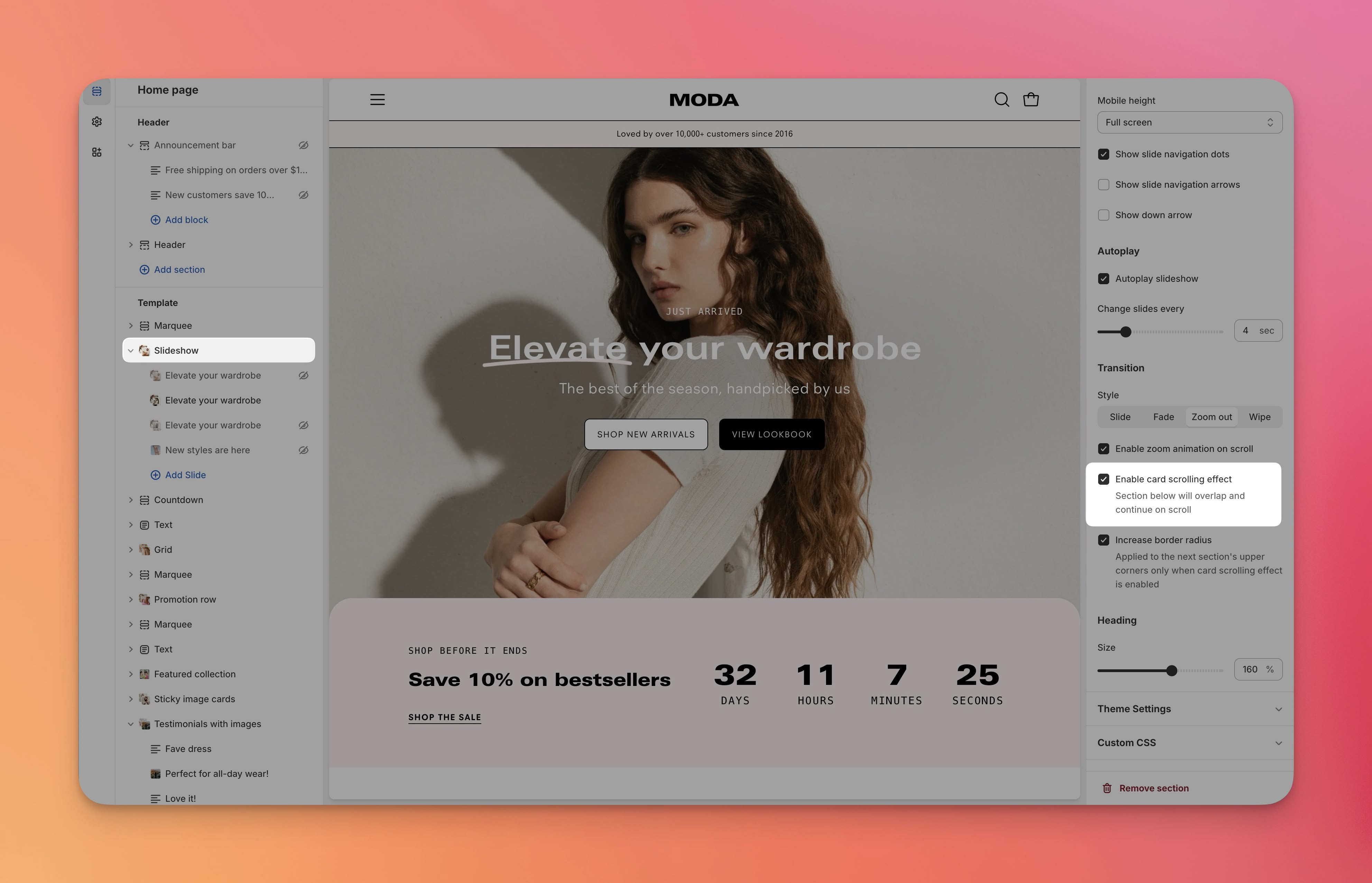 Palo Alto now includes a new card scrolling animation effect for the Banner Image and Slideshow sections. The section below will overlap and continue on the scroll: