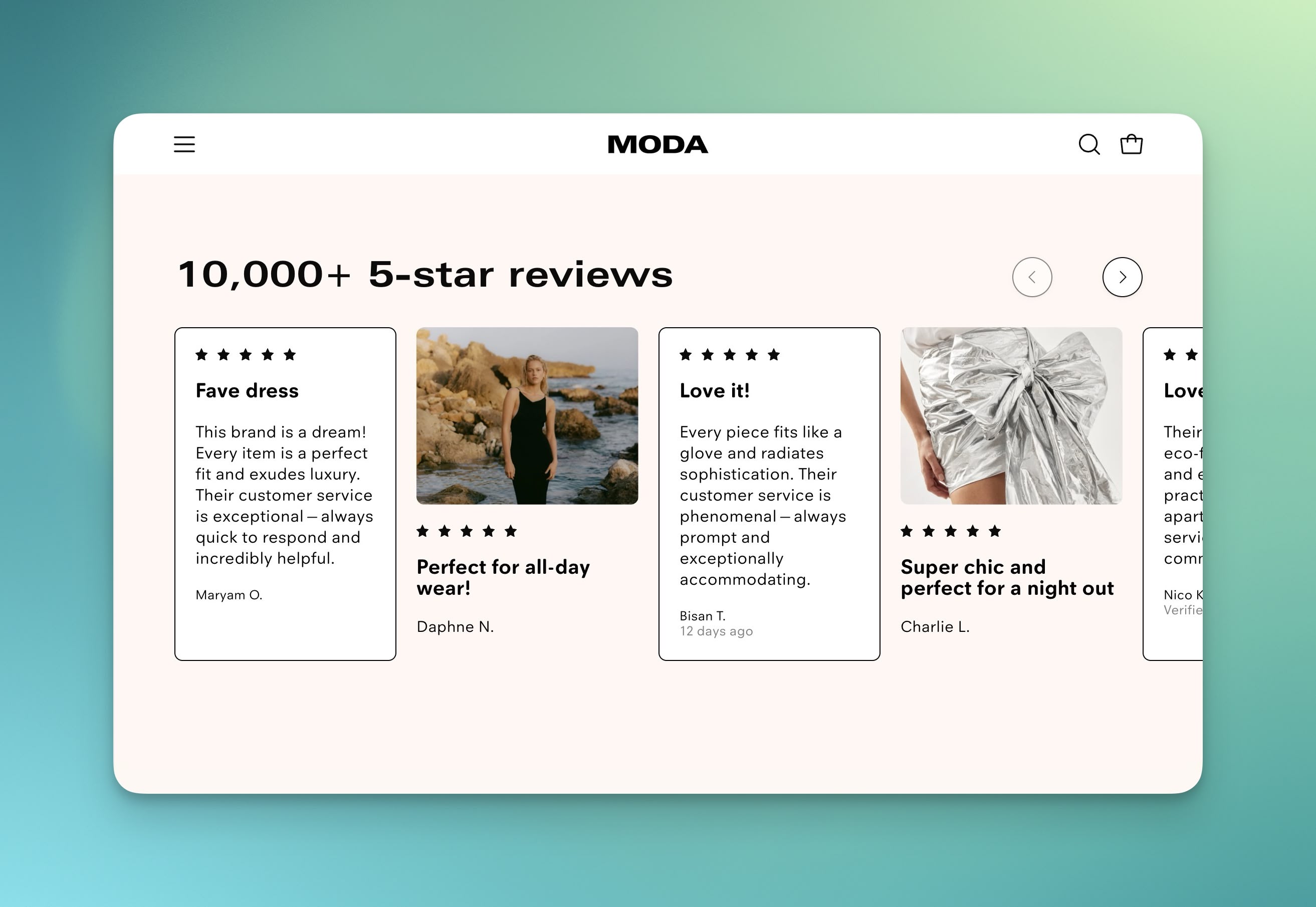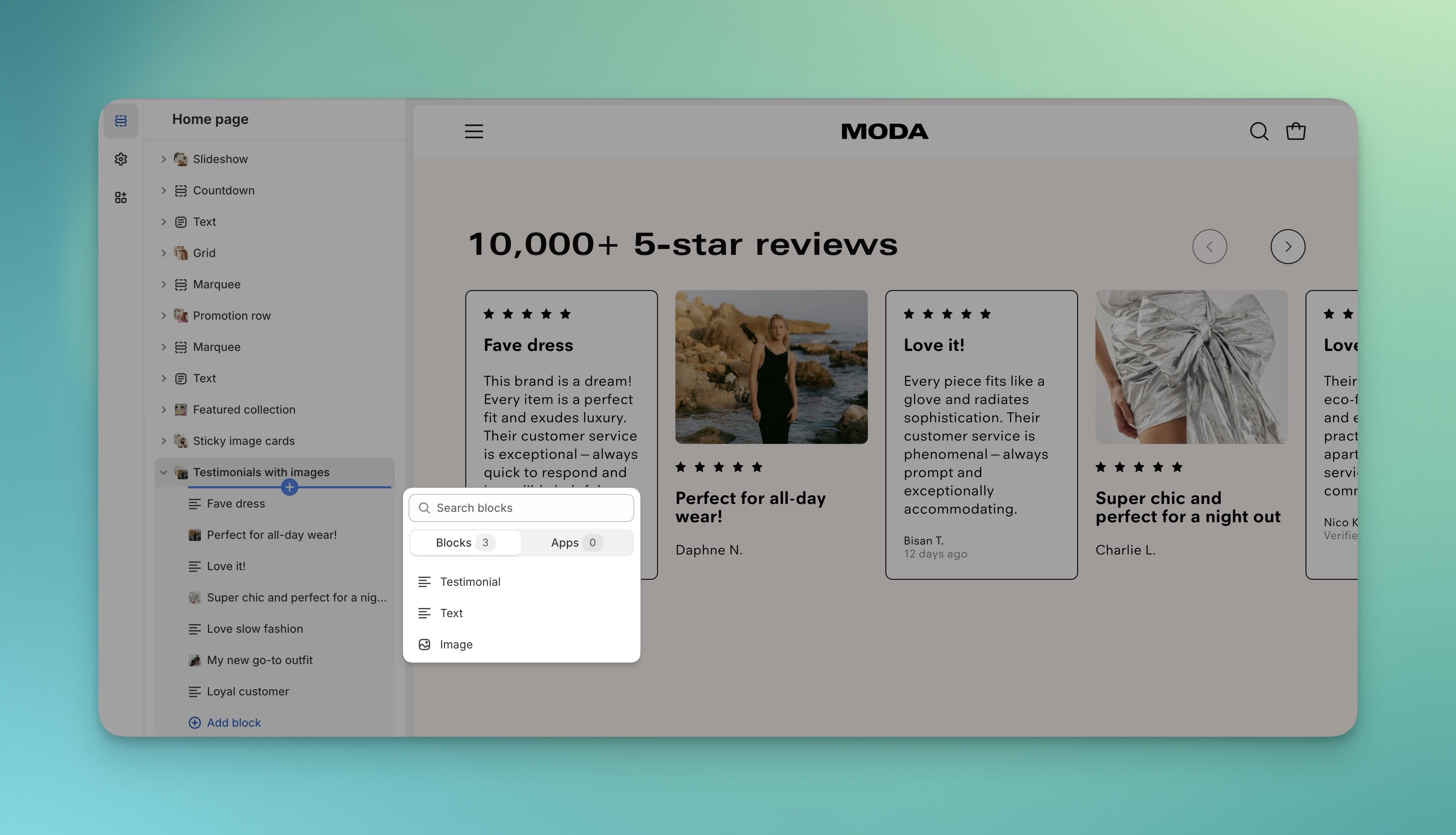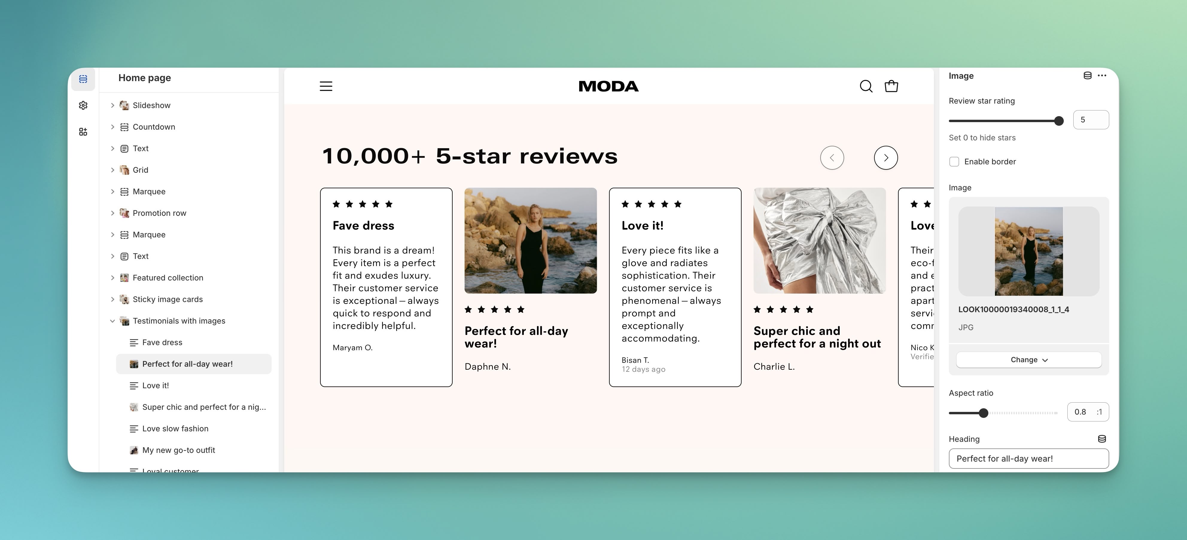 We have a new, improved testimonials section called Testimonials with images. This section will supercharge your reviews with photos, ratings, and new design elements.