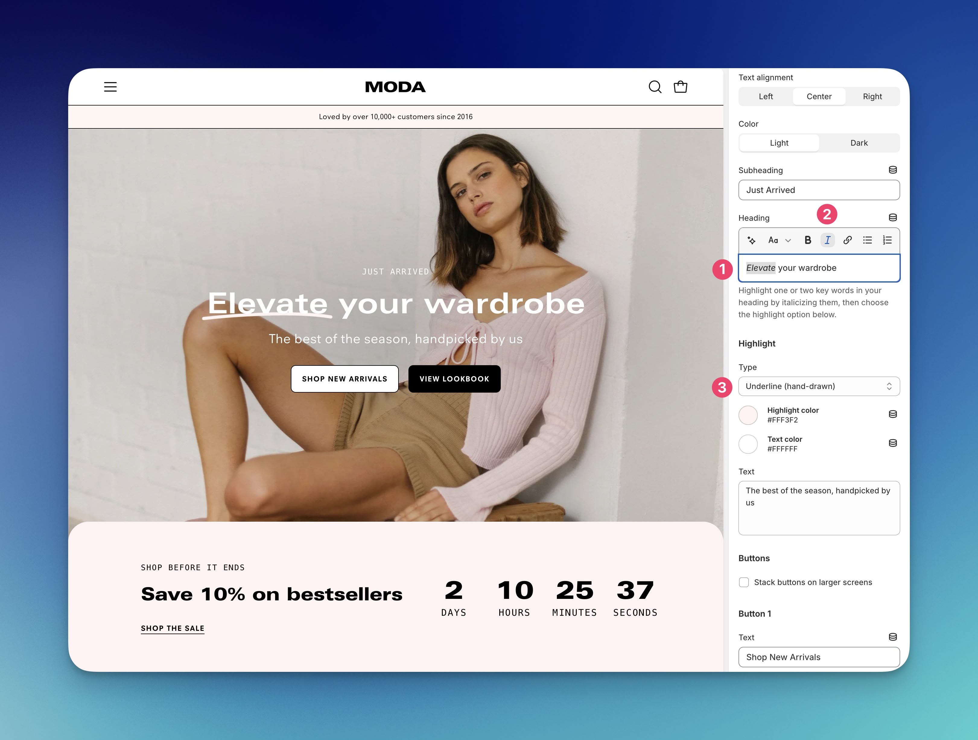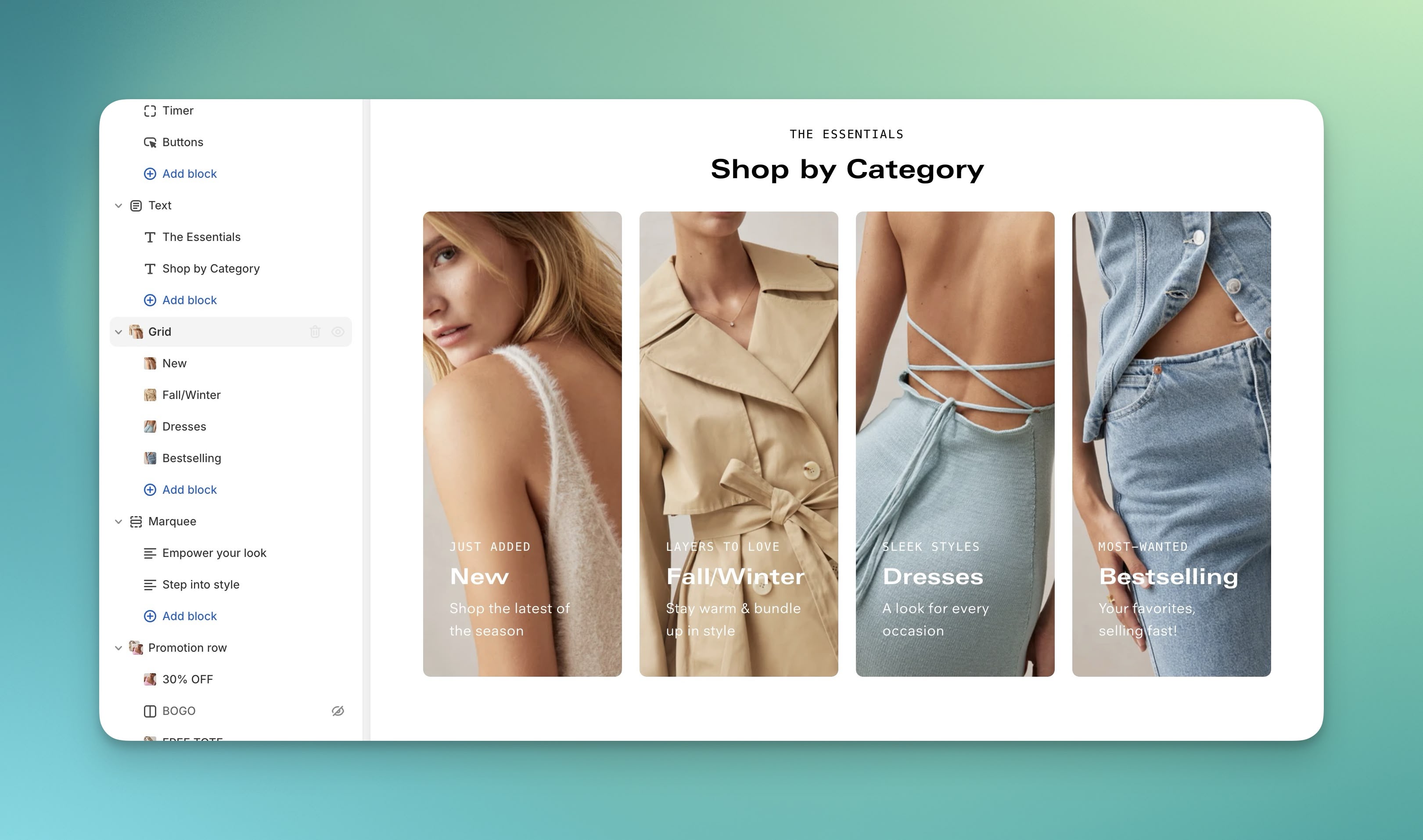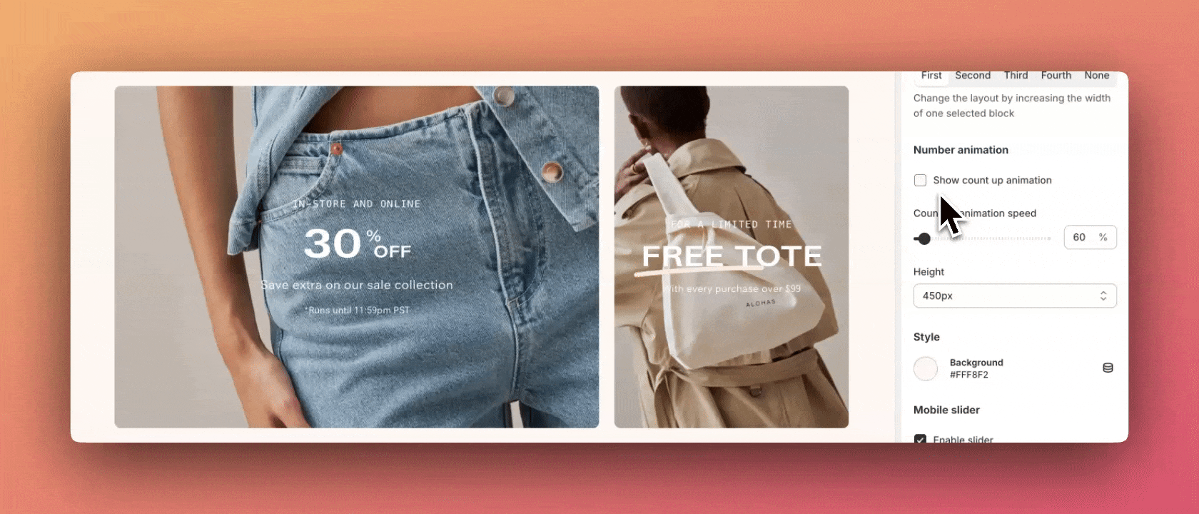 This new section is easy to set up. Add up to four blocks that make up the cards. Add a photo, supporting text content, and a call-to-action button to each card. Mobile options include a custom image for mobile devices and a stacked or sticky layout.