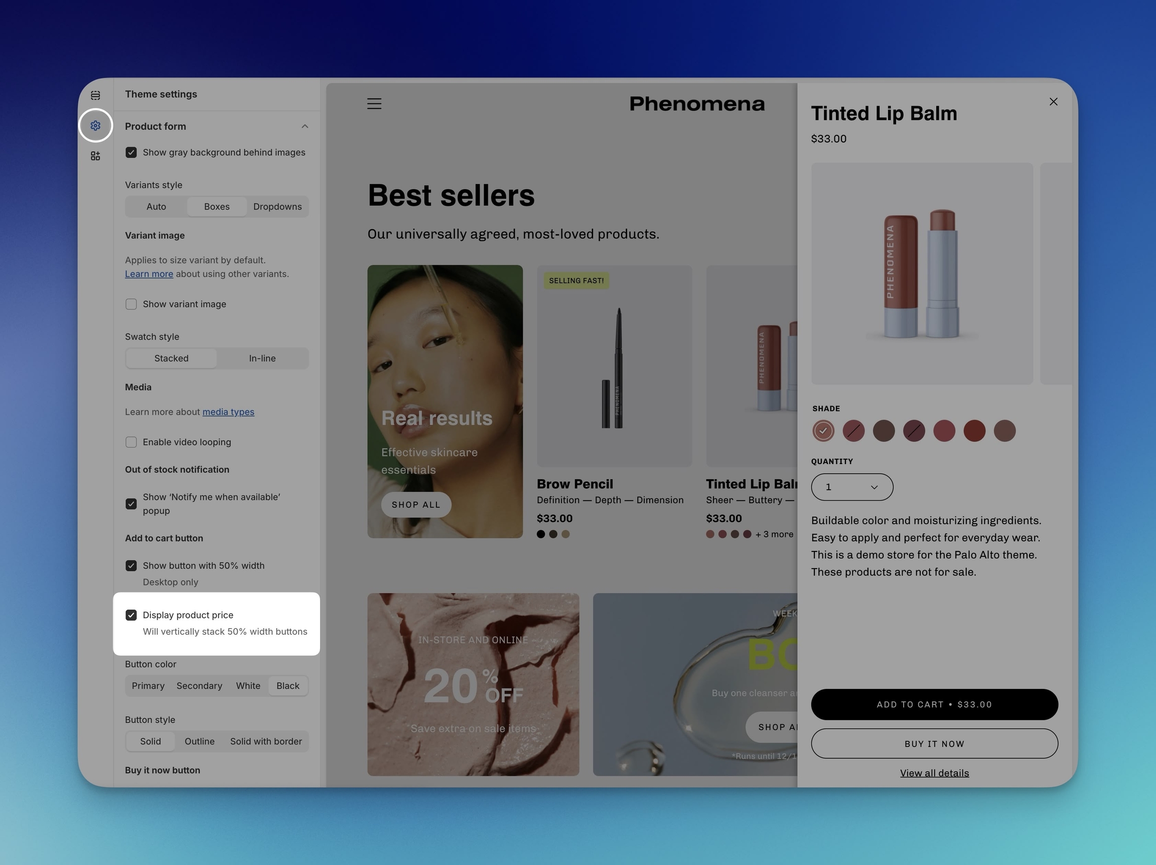The Add to Cart Button now has the option to include the price inside the button, which helps customers see the cost of the current selection.