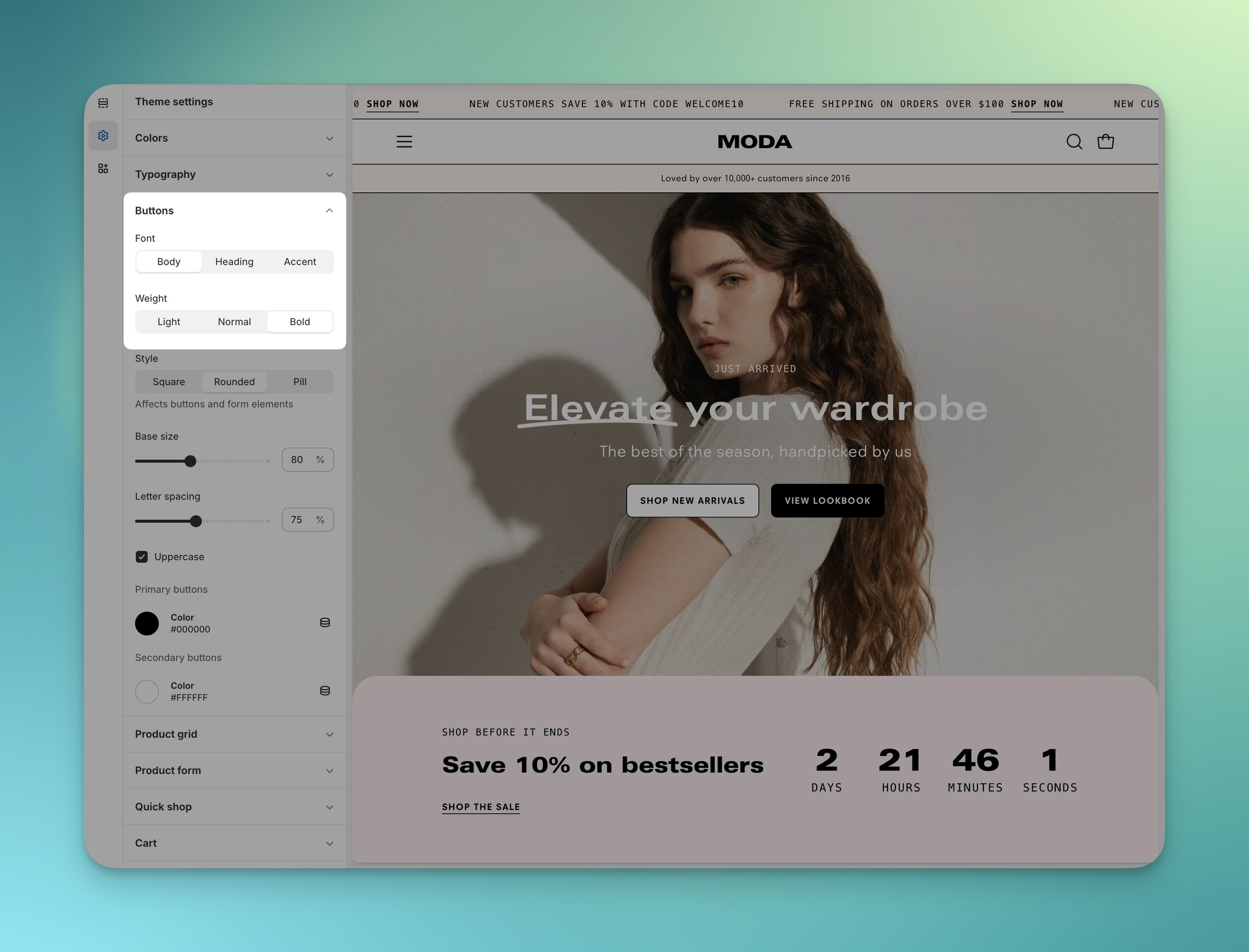 We've introduced "Font weight" and "Accent font" options to the Buttons:
